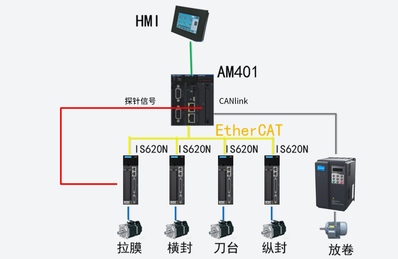 高速立包机方案,采用汇川中型PLC,使用EtherCAT总线通讯,汇川IS620N总线型伺服,精度高、响应快。方案采用多轴电子凸轮,精简化程序;采用连续拉膜方式,横封机构跟随拉膜走追剪工艺,整机速度更快;采用光电检测拉膜色标,追标工艺实现对色标的不断纠正,提高包装精度。整机稳定运行速度在130-150包每分钟,追标精度≤±1mm,长时间运行稳定,且操作简便、易用性极好。