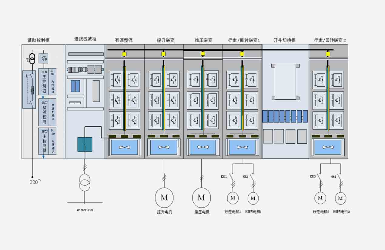 电铲为最常见的露天矿常用挖掘和装车的大型装备。本次12立方交流电铲驱动系统 统一进线单元、共直流母线;整流采用AFE方式,提升和推压采用一拖一方案;行走和回转共用一组驱动器采用接触器切换方案,回转2台逆变器采用主从控制分别驱动2台电机,走行为2台逆变器单独控制分别驱动2台走行电机,切换接触器及控制继电器、开斗电机变流器统一布置在切换柜内,辅助控制柜统一布置控制系统。